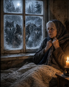 Kada je starica prišla prozoru i pogledala van, zapanila se. Devetero vukova stajalo je ispred njene kuće. Njihove sjajne oči svijetlile su u tami, a figura svakog vuka bila je obavijena misterijom. Nisu se pomjerali, nisu pokazivali znake agresije ili straha. Samo su stajali, promatrajući je. U tom momentu, starici je postalo jasno da je ovo više od običnog susreta s divljim životinjama. Bilo je to kao da su je vukovi pozvali da im se pridruži u nekom skrivenom ritualu. Sjećajući se starih priča o duhovima šume, osjećala je da je na pragu nečega što nadilazi ljudsko razumijevanje. Prošlo je tri dana u toj napetosti. Starica je ostala zaključana u svojoj kući, a svaki zvuk je bio pojačan strahom. Osjećala je da je u opasnosti, ali nije znala od čega. Vukovi su stajali ispred njene kuće, kao da su postavili barijeru između nje i slobode. Zima je bila surova, a snijeg je prekrivao svijet poput debelog pokrivača, čineći svaki izlazak potencijalno kobnim. Njena smirenost je polako nestajala, a strah se pretvarao u tjeskobu. Počela je razmišljati o svojim godinama provedenim u šumi, o tome kako je uvijek bila u skladu s prirodom, ali sada je taj sklad bio narušen.