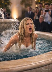 Dok su pozirali za fotografa, mladoženja je, u trenutku kada su se zagrlili, iznenada pustio mladenkinu ruku. Mladenka, potpuno nesvjesna njegovih namjera, izgubila je ravnotežu i pala prema fontani. Uslijedio je pljusak, a voda se razlila širom dvorane, stvarajući kaos i neugodnu tišinu. Gosti su momentalno zastali, a smijeh je nestao, ostavljajući atmosferu napetosti. Čak je i glazba prestala svirati, dok su svi gledali u mladenku koja je isplivala iz fontane, potpuno mokra i šokirana. Njene oči su se šokirano otvorile, a osjećaj stida i iznenađenja bio je očigledan. Mnogi gosti su se počeli šaptati, pitajući se kako je mladoženja mogao učiniti nešto tako nepromišljeno na njihov poseban dan.